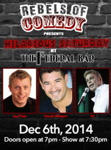 Rebels of Comedy presents Hilarious Hump Days at the Federal Bar in North Hollywood. Come out and see a night of live comedy, featuring an awesome lineup of professional features and headliner comedians. Hosted by Jay Flats, with the show's headliners : Derek Weston and TK.