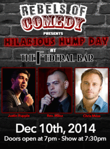 Rebels of Comedy presents Hilarious Hump Days at the Federal Bar in North Hollywood. Come out and see a night of live comedy, featuring an awesome lineup of professional features and headliner comedians. Hosted by Justin Rupple, with the show's headliners : Rev. Mitcz and Chris Moss.