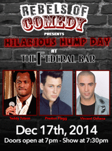 Rebels of Comedy presents Hilarious Hump Days at the Federal Bar in North Hollywood. Come out and see a night of live comedy, featuring an awesome lineup of professional features and headliner comedians. Hosted by Teddy Tutson, with the show's headliners : Preston Flagg and Vincent Oshana.