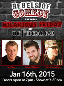 Rebels of Comedy presents Hilarious Hump Days at the Federal Bar in North Hollywood. Come out and see a night of live comedy, featuring an awesome lineup of professional features and headliner comedians. Hosted by Jay Flats, with the show's headliners : Conor McGuire and Rick Cummings.