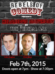 Rebels of Comedy presents Hilarious Hump Days at the Federal Bar in North Hollywood. Come out and see a night of live comedy, featuring an awesome lineup of professional features and headliner comedians. Hosted by Colin Hughes, with the show's headliners : Chris Moss and TK.