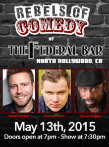It's Rebels of Comedy at the Federal Bar in North Hollywood. Come out and see a night of live comedy, featuring an awesome lineup of professional features and headliner comedians. Featuring : Adam Yenser, Denys Petrov, and Bruce Jingles.