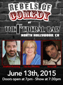 It's Rebels of Comedy at the Federal Bar in North Hollywood. Come out and see a night of live comedy, featuring an awesome lineup of professional features and headliner comedians. Featuring Jonathan Browning, with headliners : Lisa-Gay Tremblay, Steve Lolli