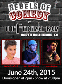 It's Rebels of Comedy at the Federal Bar in North Hollywood. Come out and see a night of live comedy, featuring an awesome lineup of professional features and headliner comedians. Featuring Kaela Crawford, with headliners : Alex Mandelberg, Justin Rupple