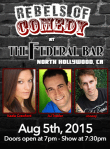 It's Rebels of Comedy at the Federal Bar in North Hollywood. Come out and see a night of live comedy, featuring an awesome lineup of professional features and headliner comedians. Featuring Kaela Crawford, with Headliners AJ Trexler, Jonesy