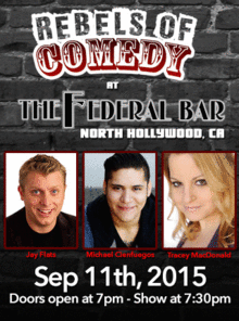 It's Rebels of Comedy at the Federal Bar in North Hollywood. Come out and see a night of live comedy, featuring an awesome lineup of professional features and headliner comedians. Hosted By Jay Flats, with Headliners Michael Cienfuegos, Tracey MacDonald