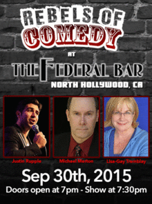 It's Rebels of Comedy at the Federal Bar in North Hollywood. Come out and see a night of live comedy, featuring an awesome lineup of professional features and headliner comedians. Hosted By Justin Rupple, with Headliners Michael Merton, Lisa-Gay Tremblay