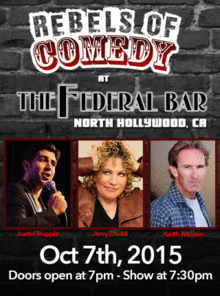 It's Rebels of Comedy at the Federal Bar in North Hollywood. Come out and see a night of live comedy, featuring an awesome lineup of professional features and headliner comedians. Hosted By Justin Rupple, with Headliners Amy Dodd, Keith Nelson.