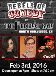 It's Rebels of Comedy at the Federal Bar in North Hollywood. Come out and see a night of live comedy, featuring an awesome lineup of professional features and headliner comedians. Hosted by Teddy Tutson with Headliners Catherine Adell, Jon Durnell