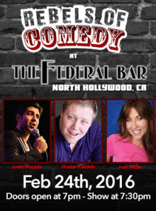 It's Rebels of Comedy at the Federal Bar in North Hollywood. Come out and see a night of live comedy, featuring an awesome lineup of professional features and headliner comedians. Hosted by Justin Rupple with Headliners Hunter Canedy, Jodi Miller