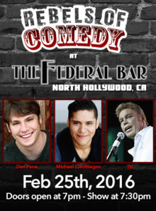 It's Rebels of Comedy at the Federal Bar in North Hollywood. Come out and see a night of live comedy, featuring an awesome lineup of professional features and headliner comedians. With Headliners Dan Pena, Michael Cienfuegos, TK