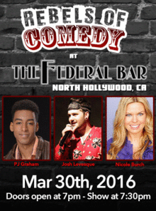 It's Rebels of Comedy at the Federal Bar in North Hollywood. Come out and see a night of live comedy, featuring an awesome lineup of professional features and headliner comedians. Featuring PJ Graham with Headliners Josh Levesque, Nicole Burch