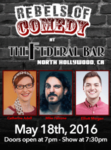 It's Rebels of Comedy at the Federal Bar in North Hollywood. Come out and see a night of live comedy, featuring an awesome lineup of professional features and headliner comedians. Hosted by Catherine Adell with Headliners Mike Falzone, Elliott Morgan