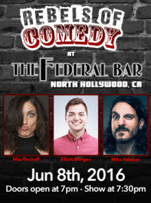 It's Rebels of Comedy at the Federal Bar in North Hollywood. Come out and see a night of live comedy, featuring an awesome lineup of professional features and headliner comedians. Hosted by Mia Pinchoff with Headliners Elliott Morgan, Mike Falzone