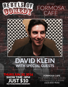 It's Rebels of Comedy at the Formosa Cafe in West Hollywood. Come out and see a night of live comedy, featuring an awesome lineup of professional features and headliner comedians.