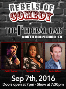 It's Rebels of Comedy at the Federal Bar in North Hollywood. Come out and see a night of live comedy, featuring an awesome lineup of professional features and headliner comedians. Hosted by Justin Rupple with Headliners Margot Evans, Keith Nelson
