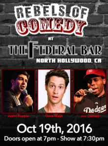 It's Rebels of Comedy at the Federal Bar in North Hollywood. Come out and see a night of live comedy, featuring an awesome lineup of professional features and headliner comedians. Hosted by Justin Rupple, with Dave Mays and Jon Durnell