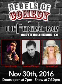 It's Rebels of Comedy at the Federal Bar in North Hollywood. Come out and see a night of live comedy, featuring an awesome lineup of professional features and headliner comedians. Hosted by Justin Rupple, with Jonathan Flanagan and Kara with a K