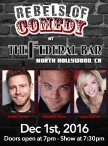 It's Rebels of Comedy at the Federal Bar in North Hollywood. Come out and see a night of live comedy, featuring an awesome lineup of professional features and headliner comedians. Hosted by Adam Yenser, with Brandon Ficara and Carla Collins