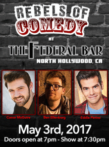 It's Rebels of Comedy at the Federal Bar in North Hollywood. Come out and see a night of live comedy, featuring an awesome lineup of professional features and headliner comedians. With Conor McGuire, Ben Ellenberg, and Eddie Perino