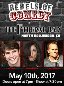 It's Rebels of Comedy at the Federal Bar in North Hollywood. Come out and see a night of live comedy, featuring an awesome lineup of professional features and headliner comedians. With Dan Pena, Mia Pinchoff, and Adam Hunter