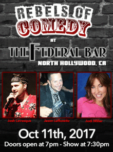 It's Rebels of Comedy at the Federal Bar in North Hollywood. Come out and see a night of live comedy, featuring an awesome lineup of professional features and headliner comedians. Hosted by Josh Levesque, with Jason Lefkowitz, Jodi Miller