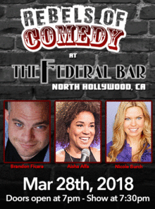 It's Rebels of Comedy at the Federal Bar in North Hollywood. Come out and see a night of live comedy, featuring an awesome lineup of professional features and headliner comedians.