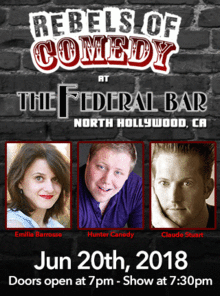 It's Rebels of Comedy at the Federal Bar in North Hollywood. Come out and see a night of live comedy, featuring an awesome lineup of professional features and headliner comedians.