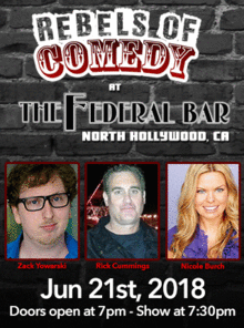 It's Rebels of Comedy at the Federal Bar in North Hollywood. Come out and see a night of live comedy, featuring an awesome lineup of professional features and headliner comedians.