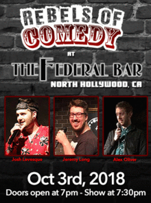 It's Rebels of Comedy at the Federal Bar in North Hollywood. Come out and see a night of live comedy, featuring an awesome lineup of professional features and headliner comedians.