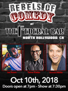 It's Rebels of Comedy at the Federal Bar in North Hollywood. Come out and see a night of live comedy, featuring an awesome lineup of professional features and headliner comedians.