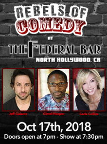 It's Rebels of Comedy at the Federal Bar in North Hollywood. Come out and see a night of live comedy, featuring an awesome lineup of professional features and headliner comedians.