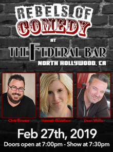 It's Rebels of Comedy at the Federal Bar in North Hollywood. Come out and see a night of live comedy, featuring an awesome lineup of professional features and headliner comedians.