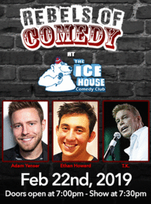 It's Rebels of Comedy at the IceHouse in Pasadena. Come out and see a night of live comedy, featuring an awesome lineup of professional features and headliner comedians.