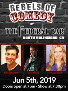 It's Rebels of Comedy at the Federal Bar in North Hollywood. Come out and see a night of live comedy, featuring an awesome lineup of professional features and headliner comedians.
