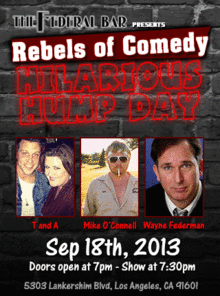 Rebels of Comedy presents Hilarious Hump Days at the Federal Bar in North Hollywood. Come out and see a night of live comedy, featuring an awesome lineup of professional features and headliner comedians. Hosted by Gary Cannon, with the show's headliners : T and A, Mike O'Connell, and Wayne Federman.