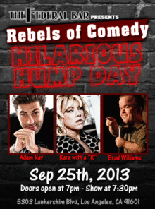 Rebels of Comedy presents Hilarious Hump Days at the Federal Bar in North Hollywood. Come out and see a night of live comedy, featuring an awesome lineup of professional features and headliner comedians. This show's headliners : Adam Ray, Kara with a "K", and Brad Williams.