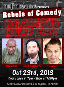 Rebels of Comedy presents Hilarious Hump Days at the Federal Bar in North Hollywood. Come out and see a night of live comedy, featuring an awesome lineup of professional features and headliner comedians. Hosted by Gary Canon, along with headliners : Rawle Dee, Jacob Daugherty, and Tom Clark.