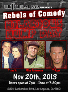 Rebels of Comedy presents Hilarious Hump Days at the Federal Bar in North Hollywood. Come out and see a night of live comedy, featuring an awesome lineup of professional features and headliner comedians. Headliners for this show : T and A, Mike Faverman, and T-Rexx.