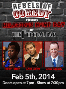 Rebels of Comedy presents Hilarious Hump Days at the Federal Bar in North Hollywood. Come out and see a night of live comedy, featuring an awesome lineup of professional features and headliner comedians.