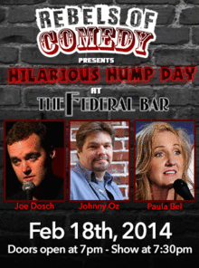 Rebels of Comedy presents Hilarious Hump Days at the Federal Bar in North Hollywood. Come out and see a night of live comedy, featuring an awesome lineup of professional features and headliner comedians.