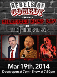 Rebels of Comedy presents Hilarious Hump Days at the Federal Bar in North Hollywood. Come out and see a night of live comedy, featuring an awesome lineup of professional features and headliner comedians.