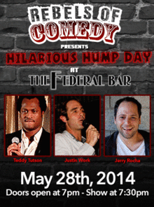 Rebels of Comedy presents Hilarious Hump Days at the Federal Bar in North Hollywood. Come out and see a night of live comedy, featuring an awesome lineup of professional features and headliner comedians. Hosted by Teddy Tutson, with the show's headliners : Justin Work, Jerry Rocha