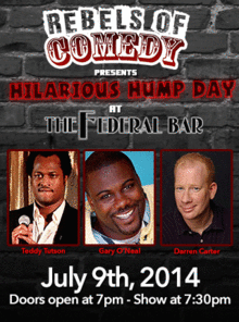 Rebels of Comedy presents Hilarious Hump Days at the Federal Bar in North Hollywood. Come out and see a night of live comedy, featuring an awesome lineup of professional features and headliner comedians. Hosted by Teddy Tutson, with the show's headliners : Gary O'Neal, Darren Carter