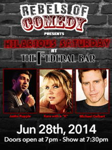 Rebels of Comedy presents Hilarious Saturdays at the Federal Bar in North Hollywood. Come out and see a night of live comedy, featuring an awesome lineup of professional features and headliner comedians. Hosted by Justin Rupple, with the show's headliners : Kara with a "K", Michael Gelbart