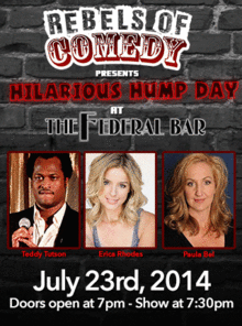 Rebels of Comedy presents Hilarious Hump Days at the Federal Bar in North Hollywood. Come out and see a night of live comedy, featuring an awesome lineup of professional features and headliner comedians. Hosted by Teddy Tutson, with the show's headliners : Erica Rhodes, Paula Bel
