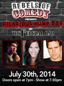 Rebels of Comedy presents Hilarious Hump Days at the Federal Bar in North Hollywood. Come out and see a night of live comedy, featuring an awesome lineup of professional features and headliner comedians. Hosted by Justin Rupple, with the show's headliners : Liz Iacuzzi, Michael Geibart