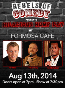 Rebels of Comedy presents Hilarious Hump Days at the Federal Bar in North Hollywood. Come out and see a night of live comedy, featuring an awesome lineup of professional features and headliner comedians. Hosted by Jay Flats, with the show's headliners : Josh Denny, Teddy Tutson