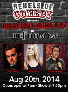 Rebels of Comedy presents Hilarious Hump Days at the Federal Bar in North Hollywood. Come out and see a night of live comedy, featuring an awesome lineup of professional features and headliner comedians. Hosted by Joe Dosch with the show's headliners : Alice Cutler, Willie Barcena
