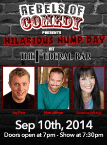 Rebels of Comedy presents Hilarious Hump Days at the Federal Bar in North Hollywood. Come out and see a night of live comedy, featuring an awesome lineup of professional features and headliner comedians. Hosted by Jay Flats with the show's headliners : Matt Iseman, Suzanne Whang